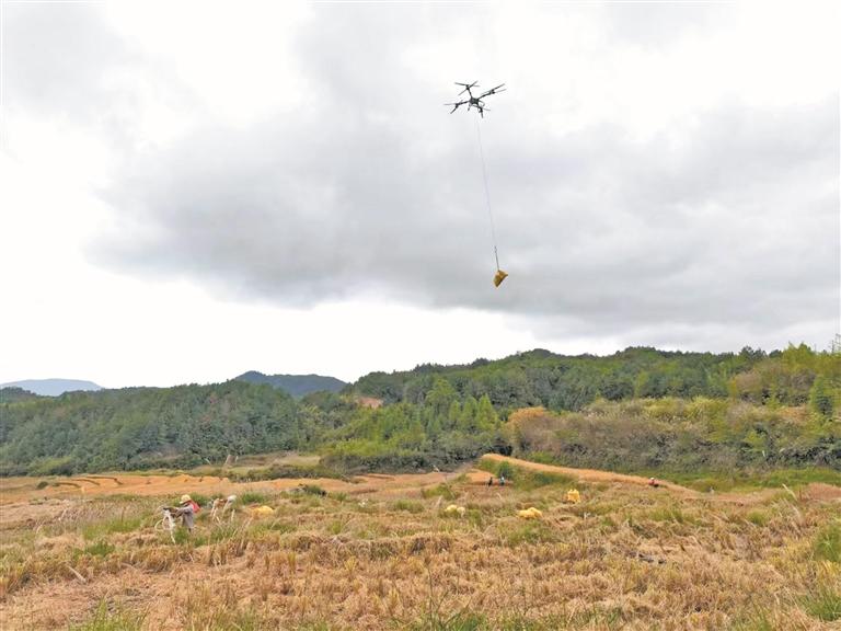 “眼前的38亩水稻,过去使用人工收割预计要10人花四五天时间,如今,1人1机两天就能收完,无人机运粮十分便捷,总成本可节约三分之一。”粮农胡世永说。