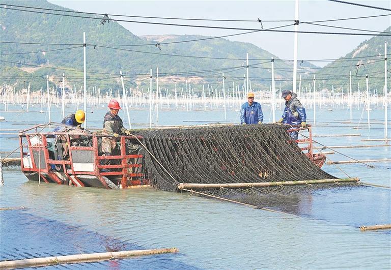 在沙埕镇环敏灶湾海域,一根根玻璃钢撑杆围出了连片的紫菜养殖网格,墨色的紫菜如丝绒般在海水中随波轻漾,在阳光下泛着油亮的光泽。养殖户驾驶着采收船穿梭于“海上阡陌”之间,随着收割机轰鸣运转,一帘帘的紫菜转眼便落入船舱(左图)。