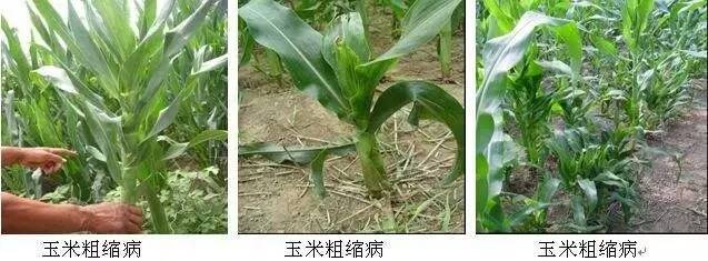 粗缩病多在玉米5-6叶时出现,病苗浓绿,节间缩短,叶片僵直,宽短而厚,植株生长缓慢、矮化。