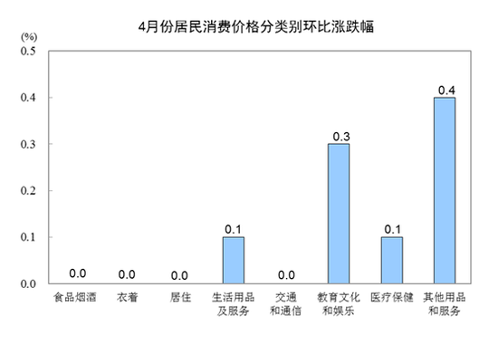 4月份,全国居民消费价格环比上涨0.1%。其中,城市和农村均上涨0.1%;食品价格下降0.1%,非食品价格上涨0.1%;消费品价格与上月持平,服务价格上涨0.2%。