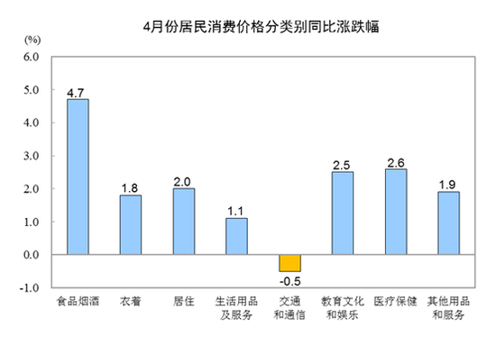 4月份,食品烟酒价格同比上涨4.7%,影响CPI(居民消费价格指数)上涨约1.40个百分点。其中,鲜菜价格上涨17.4%,影响CPI上涨约0.43个百分点;鲜果价格上涨11.9%,影响CPI上涨约0.22个百分点;畜肉类价格上涨10.1%,影响CPI上涨约0.42个百分点(猪肉价格上涨14.4%,影响CPI上涨约0.31个百分点);禽肉类价格上涨5.0%,影响CPI上涨约0.06个百分点;鸡蛋价格上涨2.6%,影响CPI上涨约0.01个百分点;粮食价格上涨0.4%,影响CPI上涨约0.01个百分点;水产品价格下降1.4%,影响CPI下降约0.03个百分点。