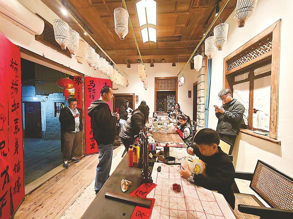 游客在“锦里·夜泊”中体验古法灯笼制作。