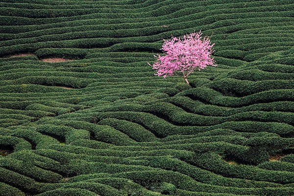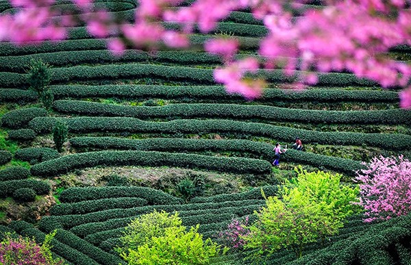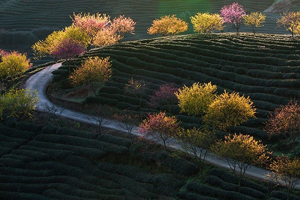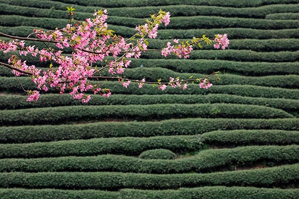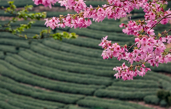 每年1至3月,福建漳平永福镇樱花茶园,15万株不同品种的樱花分批绽放在郁郁葱葱的乌龙茶茶园里,像一条条缠绕在山间的彩带。从空中看去,万亩茶园,十里樱红,美得令人心醉。