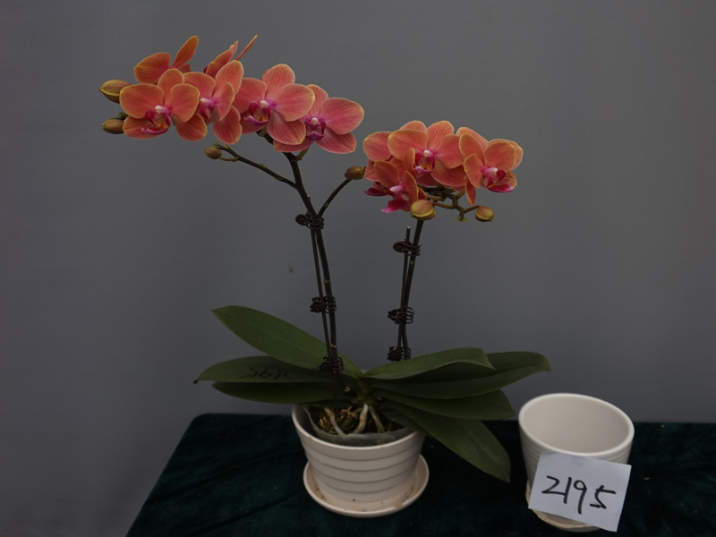 钜宝喜鹊:花径6.5cm,花梗高度30cm,叶片间距25cm,花色橙黄色,双梗花朵数多,易栽培管理。