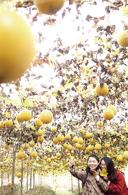 游客在江西抚州市东乡区邓家乡花果山生态园瓜蒌种植基地体验乡村乐趣。 何江华摄