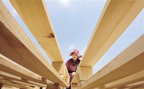 在山东省沂源县悦庄镇寨里村,一名创业者在检验加工的板材。 赵东山摄 (新华社发)
