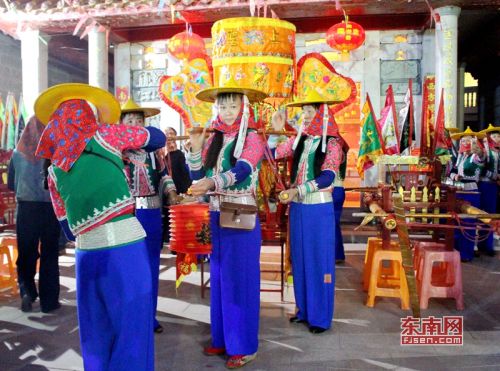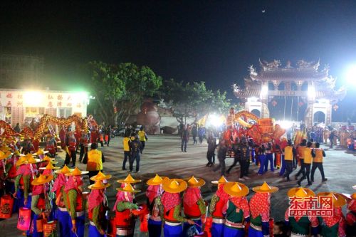 “惠女游花灯”祈福活动队伍在霞霖宫前进行闹元宵民俗活动。东南网 薛逸群 摄