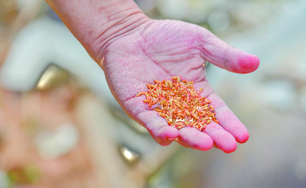 林心辉笑着向展示着他购买的新型水稻种子“。我手里的这把种子的红色部分是一种药物,可以避免鸟类叼琢。”林心辉说,今年也聘请了几名专业人才过来帮忙,预估收成时一亩可以达到2000斤左右。