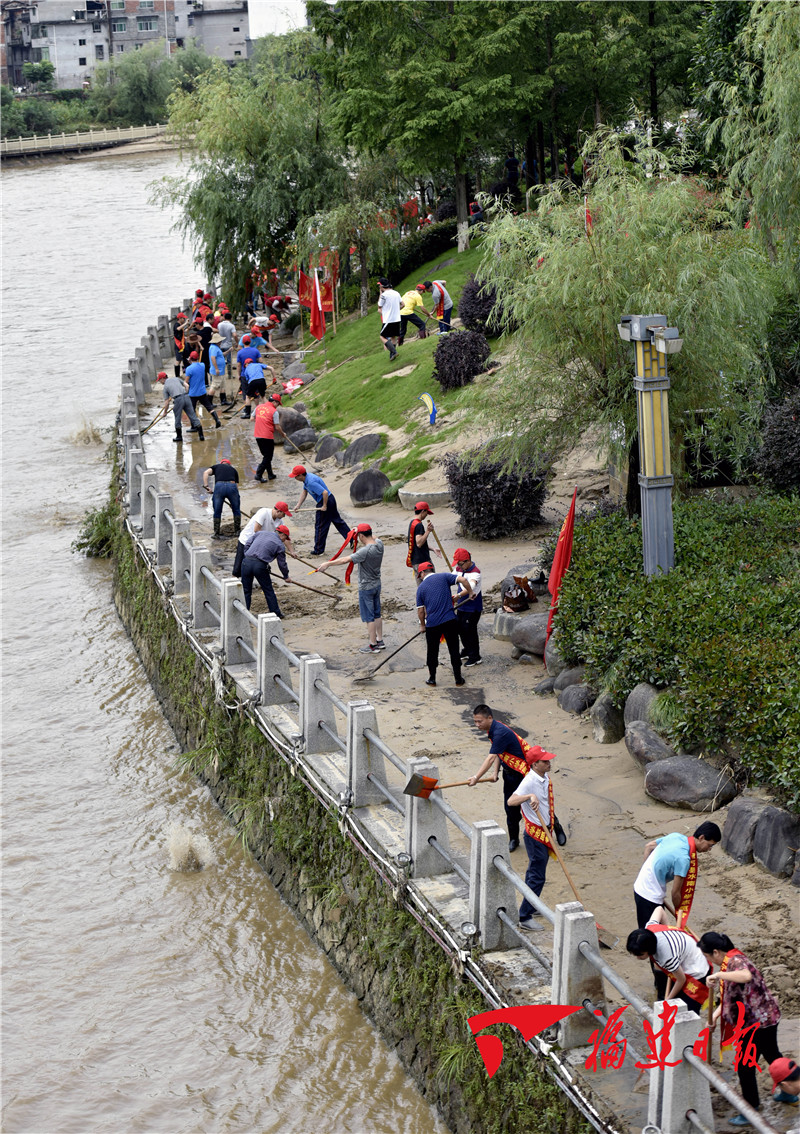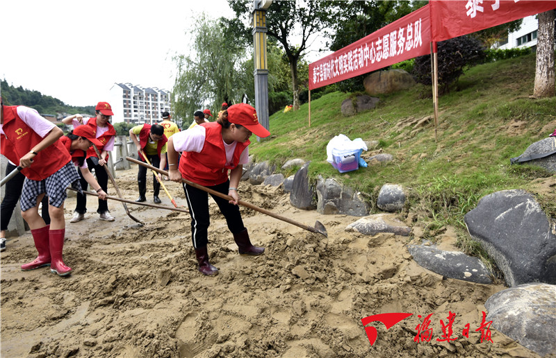 10日,洪水褪去,泰宁县600余名志愿者来到城区三河六岸的公园里,对洪灾过后堆积的淤泥、垃圾进行清理。(福建日报 方炜杭 邱灿旺 )