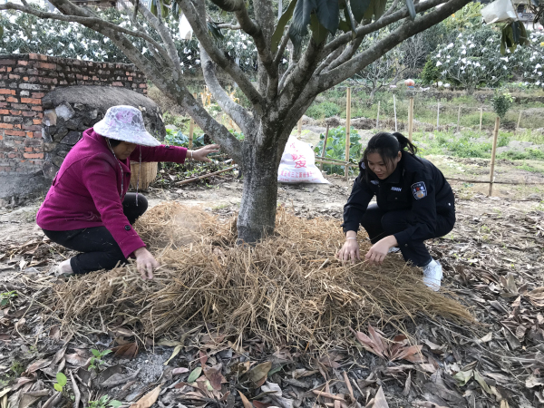 次日一大早,黄佳冰、王淑娟、刘秀金三名网格员便赶到余金烟的枇杷果园,帮助其用稻草覆盖枇杷树干及下方土壤,并为枇杷花果套上防护袋,防止霜冻影响枇杷生长。通过几人大半天的努力,余金烟家的20多棵枇杷树全部套上了防护袋。“每年冬天我们都担心天气寒冷把枇杷冻坏了,幸好今年有网格员过来帮忙,要不然真不知道要忙到什么时候。”余金烟说。