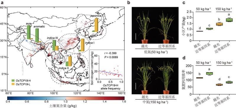 长期以来,育种的首要目标是高产,使水稻能在大量施用化肥情况下,获得较高产量。然而,这导致一些重要基因资源的丢失,以致主栽水稻品种肥料利用效率普遍较低。通过对世界水稻种植区土壤氮含量数据分析,研究团队发现,土壤越贫瘠的地方,OsTCP19氮高效变异越常见,并随着土壤氮含量的增加,氮高效类型品种逐步减少,而我国现代水稻品种中这一氮高效变异几乎全部丢失。