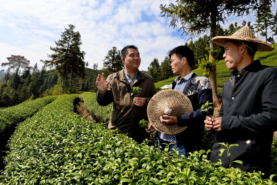 2019年3月26日,在福建省武夷山市星村镇,科技特派员与茶农在生态茶园内了解茶叶长势。新华社 安希雅 摄