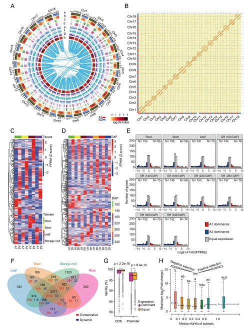 木薯是世界重要的粮食作物和能源作物,为105个国家近10亿人口提供碳水化合物来源。木薯基因组(2n = 36)具有高度杂合特征,使其成为研究等位基因分化的良好系统。目前,大多数参考基因组为单倍型镶嵌组装,限制了对基因组中等位基因变异的功能研究和育种利用。该研究针对木薯高杂合性的遗传基础及其进化驱动力,依托中国热科院热带生物组学大数据中心平台,获得了以下三方面研究结果:一是利用PacBio单分子测序和Hi-C技术绘制了木薯栽培品种SC205参考基因组图谱,Scaffold N50 达到34.5 Mb,注释了37923个基因,进一步构建了18对同源染色体高质量单体型基因组图谱,鉴定了24128个双等位基因(Bialleles);二是通过转录组分析发现双等位基因间广泛发生表达不平衡,且淀粉和蔗糖代谢途径上的双等位基因表现出显著的表达分化;三是等位基因组进化分析揭示了基因组快速进化可能是木薯高杂合性形成的重要驱动力,且基因组方向性选择驱动等位基因表达分化。该研究深化了对木薯双等位基因变异遗传基础的理解,为利用双等位基因创新木薯和其他高杂合作物育种策略提供了新见解。