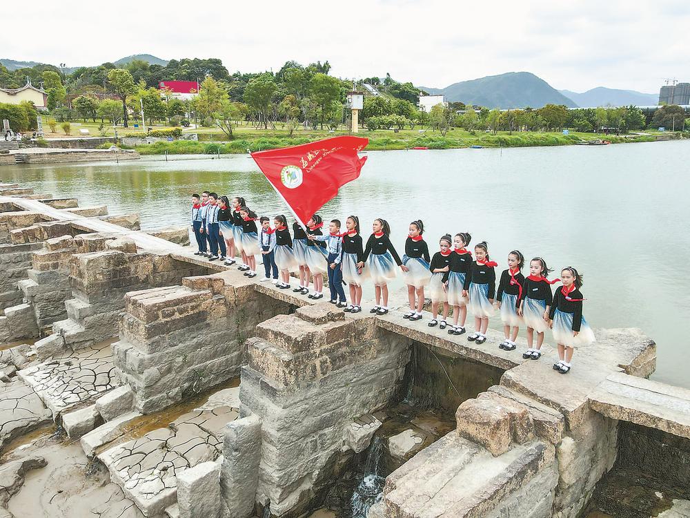 莆田市荔城区新度中心小学学生到木兰陂游览。木兰溪上这条长200多米、形同钢琴的古堰建成于1083年,被列入首批世界灌溉工程遗产名录。它是全国保存最完整的古代水利工程之一,堪称福建的“都江堰”。