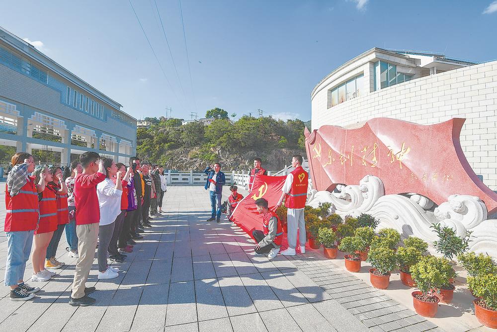 在东圳精神教育基地户外小广场,莆田学院学生志愿者在党旗前宣誓。