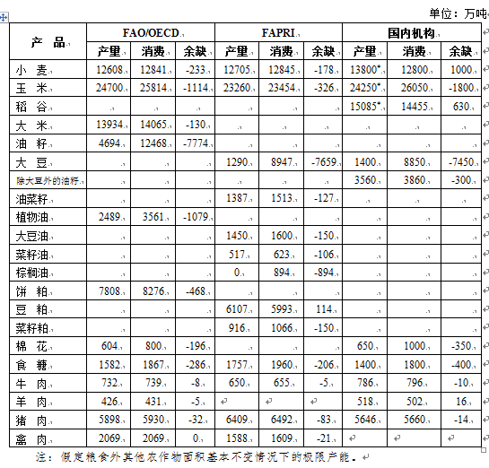 表1有关机构对2020年我国主要农产品供需及缺口的预测