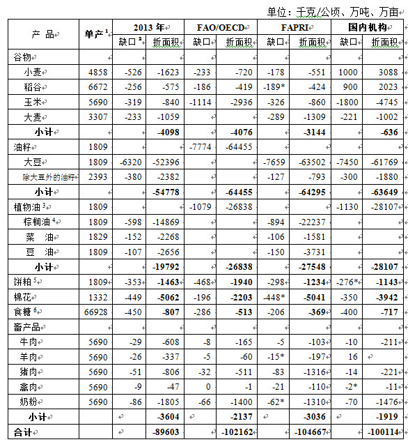 2012年FAPRI预测,到2020年我国小麦、玉米缺口分别为178万吨、326万吨;大豆和豆油缺口分别为7659万吨和150万吨;油菜籽、菜籽粕和菜籽油缺口分别为127万吨、150万吨和106万吨;棕榈油缺口为894万吨;食糖缺口为206万吨;牛肉、猪肉、禽肉缺口分别为4.9万吨、83.2万吨和20.9万吨。FAPRI的预测中没有大米、棉花和奶粉的预测数据,如果假设这些产品2020年缺口基本保持目前的净进口水平,其预测的我国主要农产品缺口也相当于10亿亩左右耕地播种面积的产出。