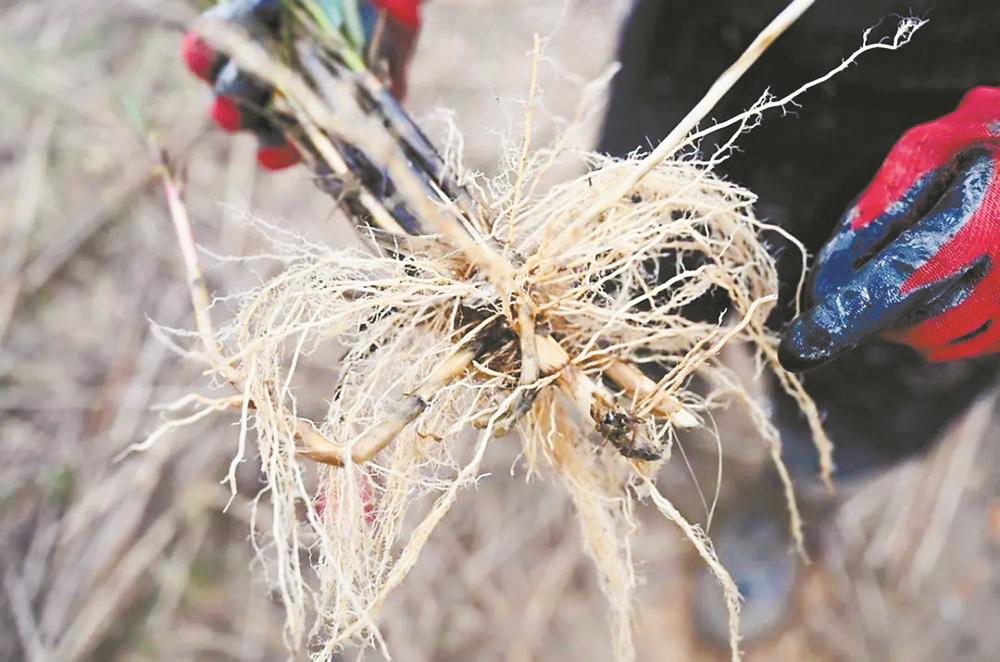 一位村民在福清湾的滩涂上展示互花米草发达的根系(资料图片)。林善传 摄