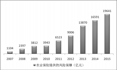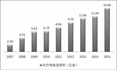 2007年—2015年,我国农业保险提供风险保障从1126亿元增长到1.96万亿元,年均增速57%,累计提供风险保障7.68万亿元,向2.08亿户次的受灾农户支付赔款1218.7亿元。2015年我国承保的主要农作物突破14亿亩,占全国播种面积的59%,三大主粮作物平均承保覆盖率超过70%,赔款支出260.08亿元,占农作物直接经济损失的9.64%。